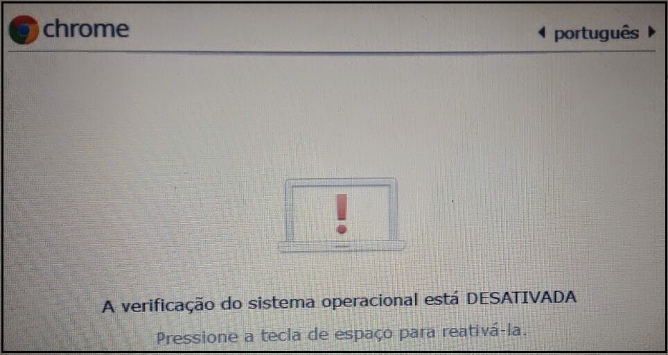 Ao iniciar o Chromebook, será exibida a tela de que “A verificação do sistema operacional está desativada”. Pressione prontamente a tecla “ESPAÇO” no seu teclado para ativar novamente, espere a transição ser feita, e então o modo do desenvolvedor será desabilitado.