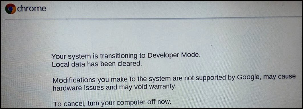 O Chromebook estará fazendo a transição para o modo do desenvolvedor, aguarde alguns instantes, uma barra preta no canto superior da tela, mostrará o andamento com a porcentagem da transição.