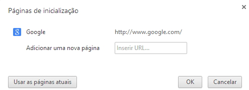 A terceira e última opção “Abrir uma página específica ou conjunto de páginas” funciona assim: O usuário escolhe que site deve ser a página inicial do Chrome. Ele pode definir isso clicando em “Configurar páginas” bem ao lado da opção. Irá abrir uma janela pequena para colocar o link do site escolhido. Vejamos a imagem abaixo: