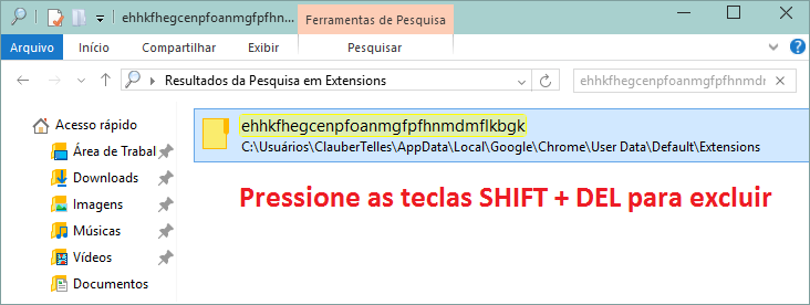 - Quando encontrada a pasta, exclua apertando no seu teclado SHIFT + DEL