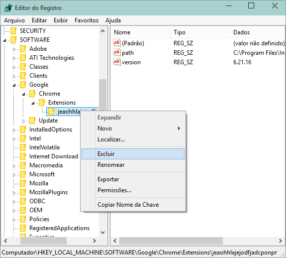 - Ao achar a chave com o nome da ID da extensão, clique com o botão direito do mouse e depois selecione “Excluir”;