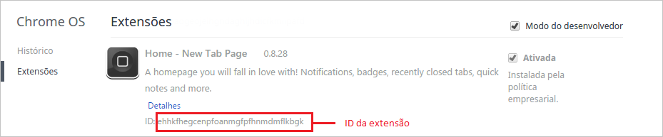 chrome:extensions na barra de endereços e pressione a tecla ENTER. Marque a opção “Modo do desenvolvedor” e então copie a ID (Se houver mais de uma anote também), conforme abaixo: